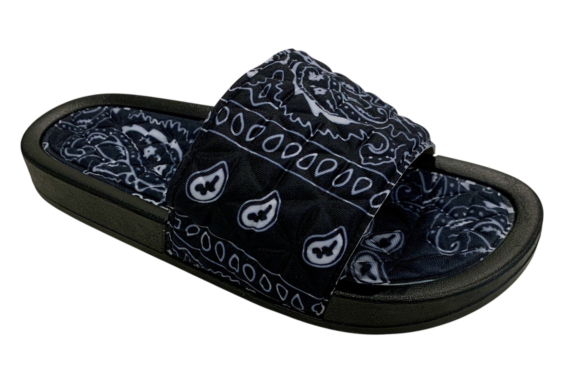 Step into bold comfort with these eye-catching black bandana print slides - a perfect mix of streetwear style and everyday ease. Designed with a cushioned 1" sole and wide strap for all-day support.