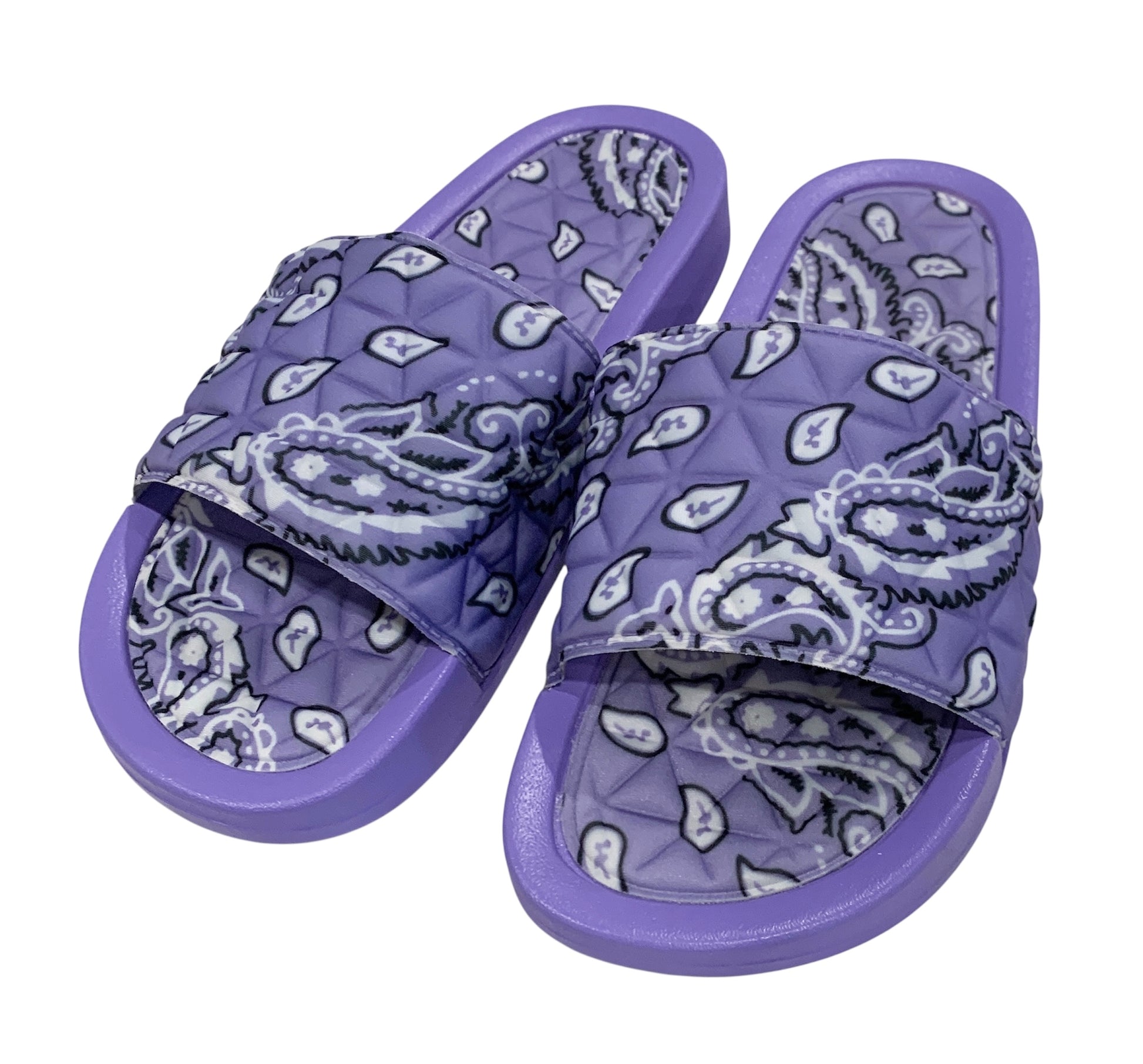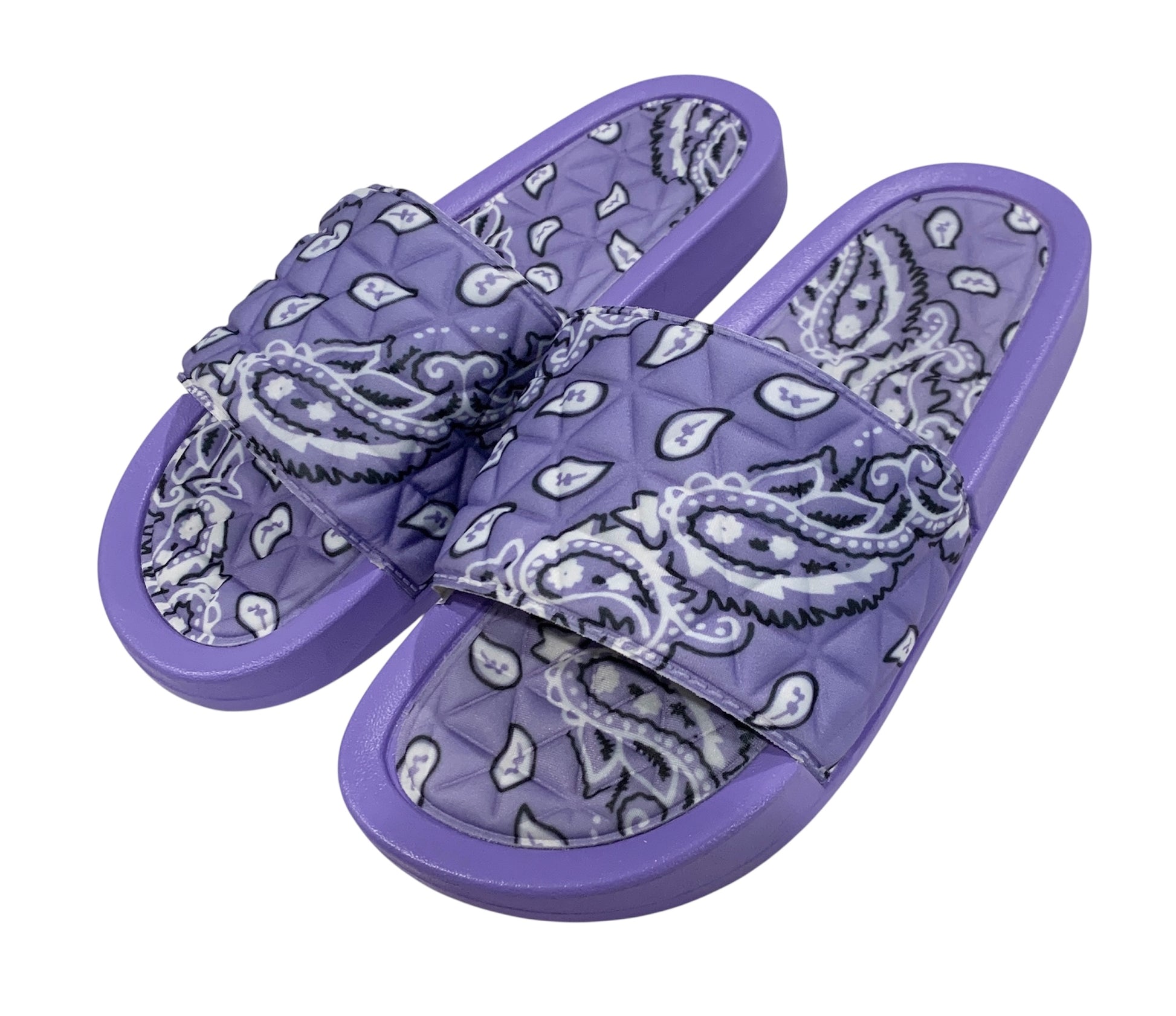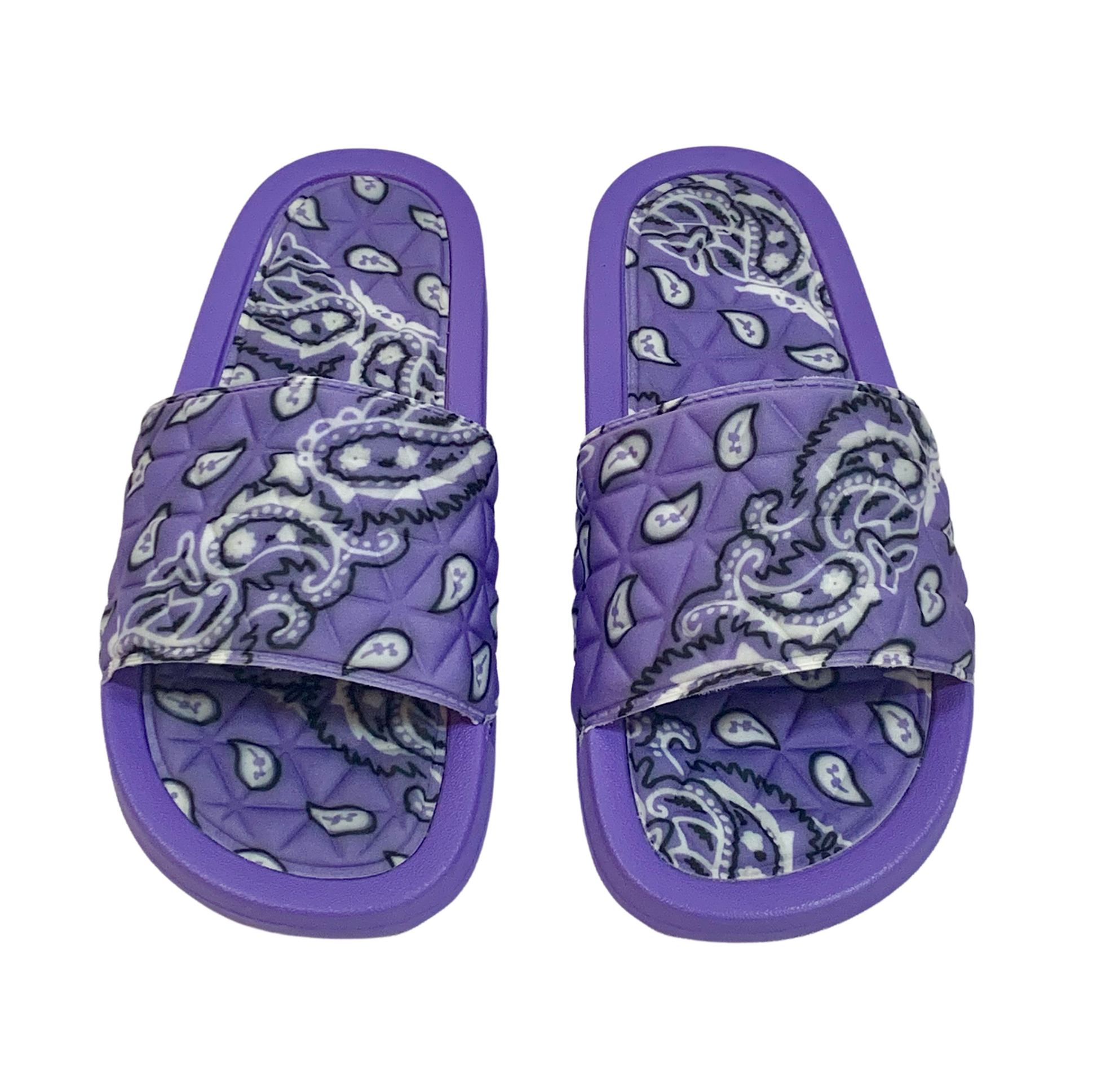 Step into bold comfort with these eye-catching purple bandana print slides - a perfect mix of streetwear style and everyday ease. Designed with a cushioned 1" sole and wide strap for all-day support.
