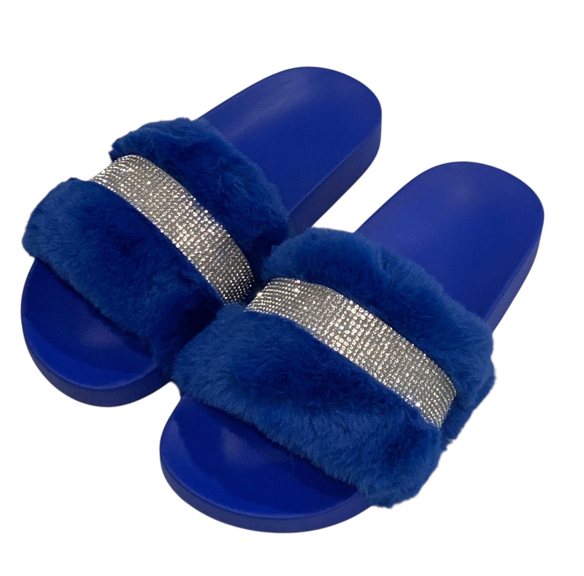 Royal Blue Faux Fur Rhinestone Slides - Comfy Crystal Slip-On Slippers