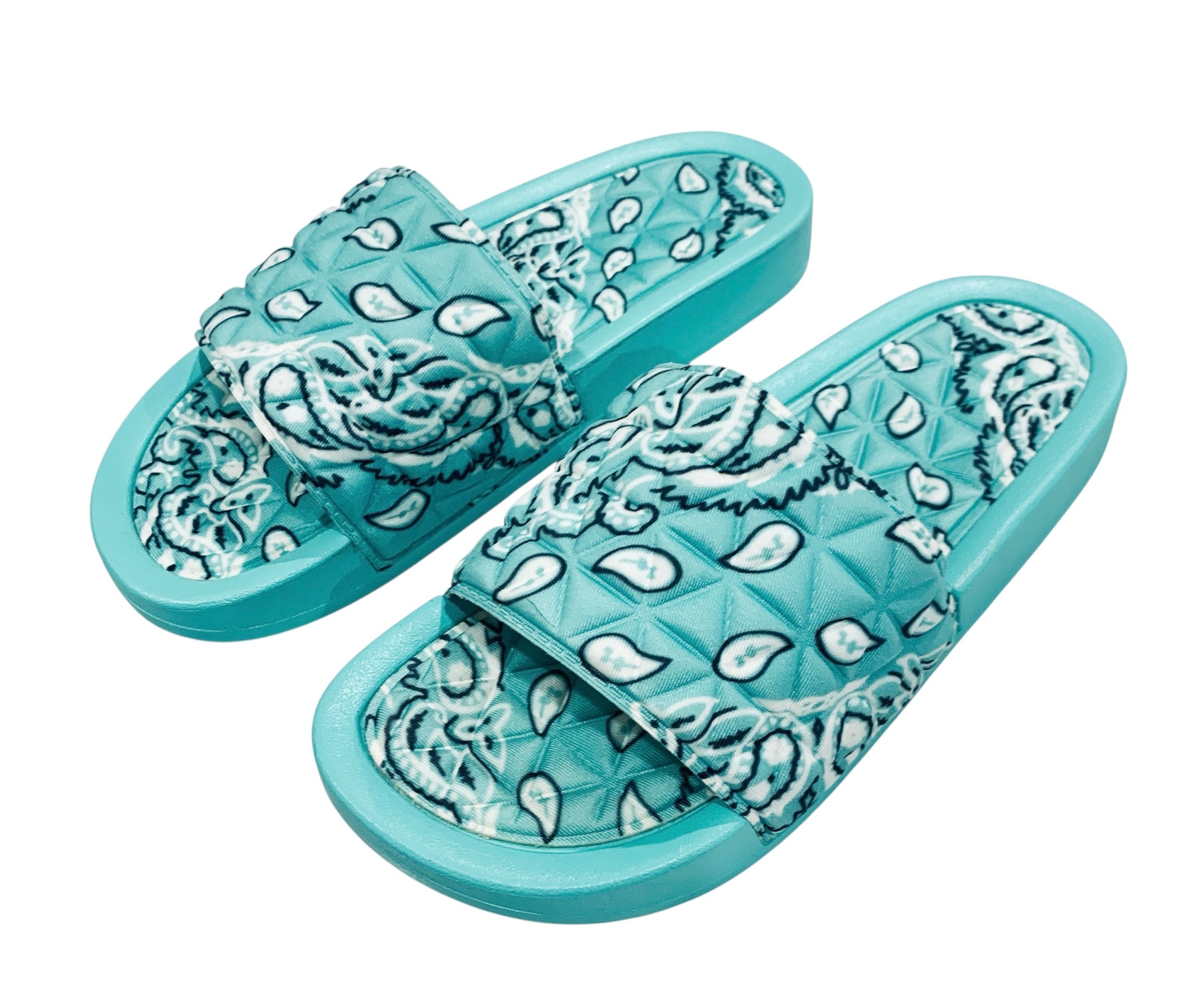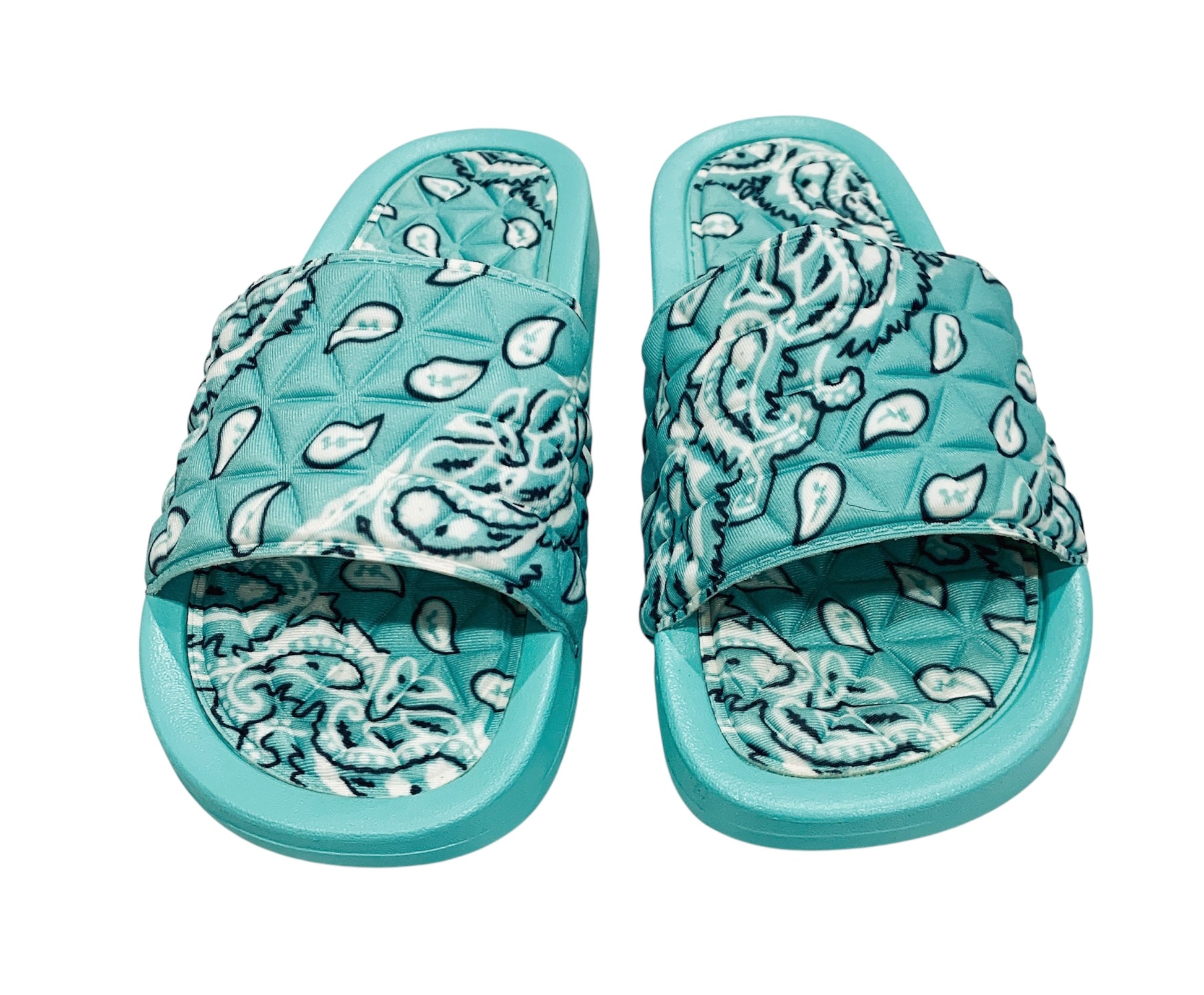Step into bold comfort with these eye-catching turquoise bandana print slides - a perfect mix of streetwear style and everyday ease. Designed with a cushioned 1" sole and wide strap for all-day support.